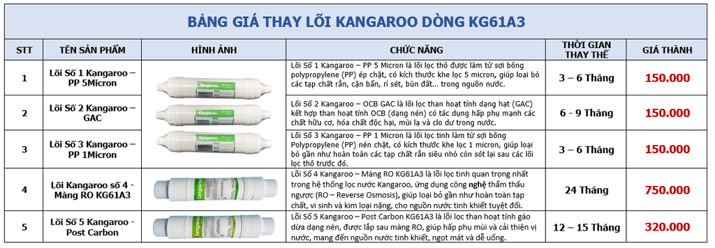 Bảng giá thay thế lõi lọc kangaroo KG61A3