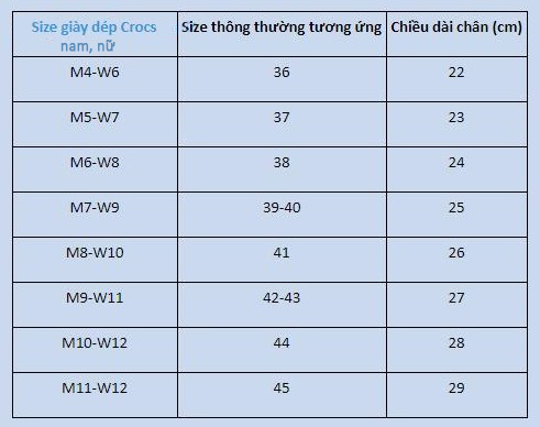 Bảng Size Dép Crocs