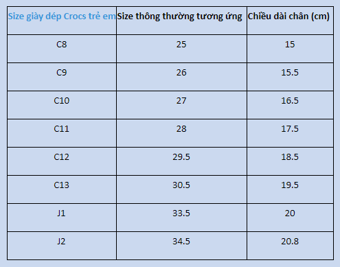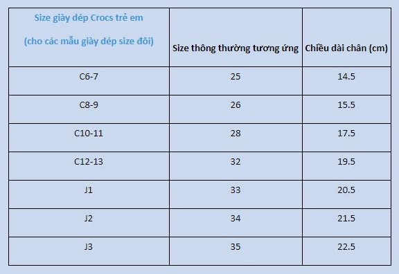BẢNG SIZE DÉP CROCS TRẺ EM