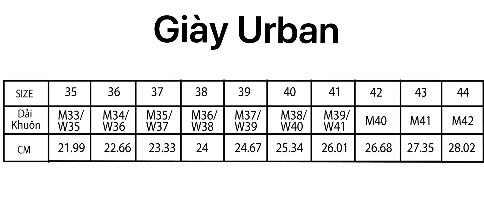 BẢNG SIZE GIÀY THƯƠNG HIỆU URBAN