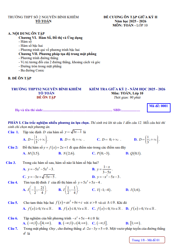 Đề cương giữa kỳ 2 Toán 10 năm 2025 – 2026 trường THPT Nguyễn Bỉnh Khiêm 2 – Gia Lai 03/03/2026