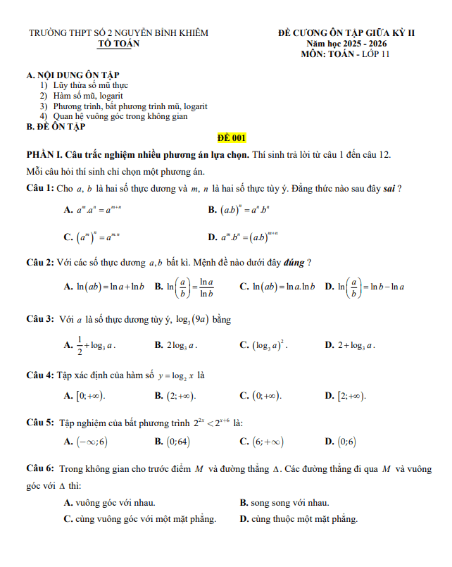 Đề cương giữa kỳ 2 Toán 11 năm 2025 – 2026 trường THPT Nguyễn Bỉnh Khiêm 2 – Gia Lai 03/03/2026