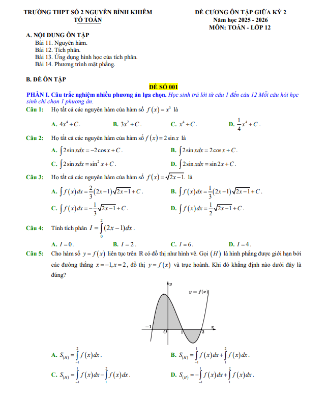 Đề cương giữa kỳ 2 Toán 12 năm 2025 – 2026 trường THPT Nguyễn Bỉnh Khiêm 2 – Gia Lai 03/03/2026
