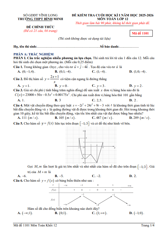 Đề cuối học kì 1 Toán 12 năm 2025 – 2026 trường THPT Bình Minh – Vĩnh Long 11/01/2026