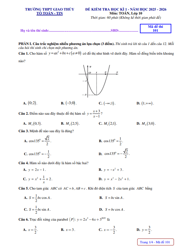Đề học kì 1 Toán 10 năm 2025 – 2026 trường THPT Giao Thủy – Ninh Bình 11/01/2026