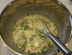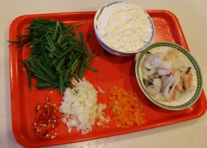 Pha 1 chén rưỡi nước lạnh vào bột. Khuấy đều rồi cho tất cả nguyên vật liệu trên vào. Hỗn hợp bột sẽ lỏng hơn bột bánh xèo Vn của ta một chút. Không cần nêm nếm gì thêm vì lát ta ăn chấm nước tương pha.
