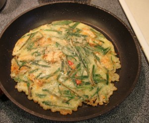 Món này chồng hay rủ vợ nhậu khuya, vì làm cũng nhanh. Hoặc chỉ là món nhẹ chứ không ăn trừ cơm. Khi ra nhà hàng đặt món này họ chỉ bưng ra đúng một cái. Ở nhà mẹ chồng hay chiên cả một thau bột bự tổ chảng. Các miếng bánh sếp chồng cao trên dĩa rồi để đó. Ai đói hay buồn miệng cứ ăn. Không cần thiết phải nóng giòn gì cả.Tất nhiên bánh xèo hẹ phải ăn chung với Kimchi, chấm nước tương. Ăn mà không có Kimchi sẽ rất ngán, lạt lẽo.