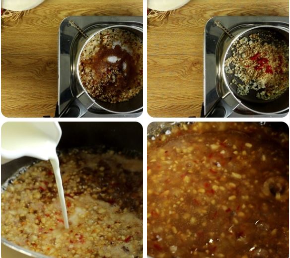 – Làm nước chấm ram: Đặt chảo nóng, đổ 1 muỗng tỏi, 20gr đậu phộng, 10gr bắp nếp băm, 10gr ớt băm, 10gr nước tương, 10gr đường, 20ml nước rồi khuấy đều. Đến khi hỗn hợp sôi, bạn cho 20ml nước bột bắp vào chảo, tiếp tục đun khi thấy nước sốt chấm ram đã sệt lại thì tắt bếp.