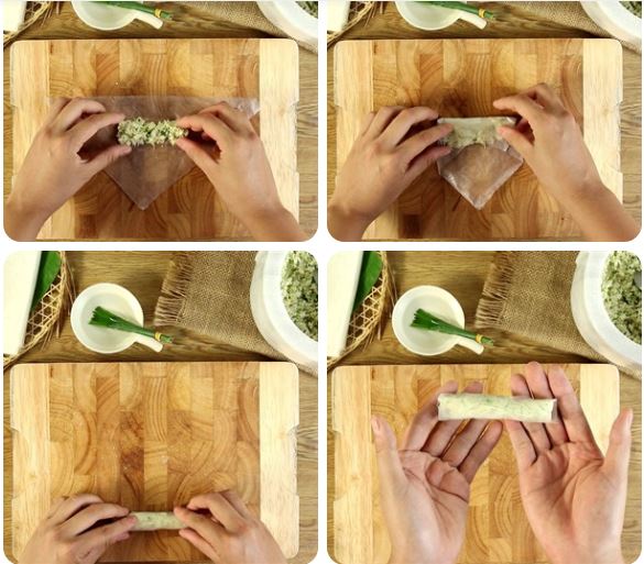 Rải bắp nếp lên trên rồi cuốn bánh tráng lại