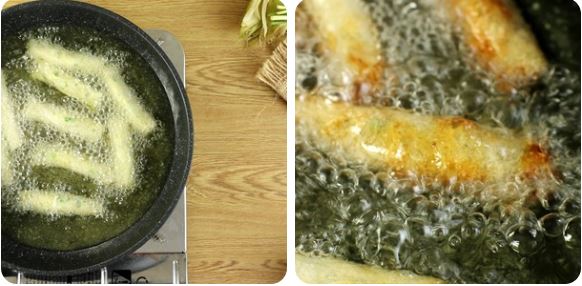Tiến hành chiên ram bắp nếp trong chảo ngập dầu trên lửa vừa. Cho đến khi ram bắp chuyển sang màu vàng giòn thì gắp ra, đặt trên đĩa có giấy thấm dầu.