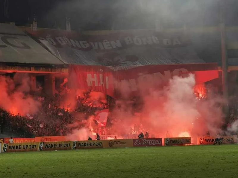 Không lâu sau vụ “cháy sân” vì CĐV Hải Phòng, nay sân Hàng Đẫy lại bị pháo sáng bởi CĐV Nam Định. Ảnh: NGỌC DUNG