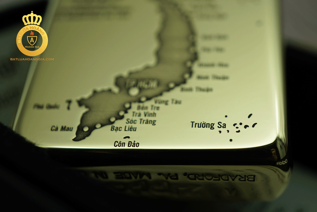 Hình ảnh bản đồ Việt Nam và các quần đảo Hoàng Sa, Trường Sa... trên vỏ của chiếc Zippo được khắc chìm bằng công nghệ khắc ăn mòn axit rất sâu và sắc nét nên không mòn hình theo thời gian.
