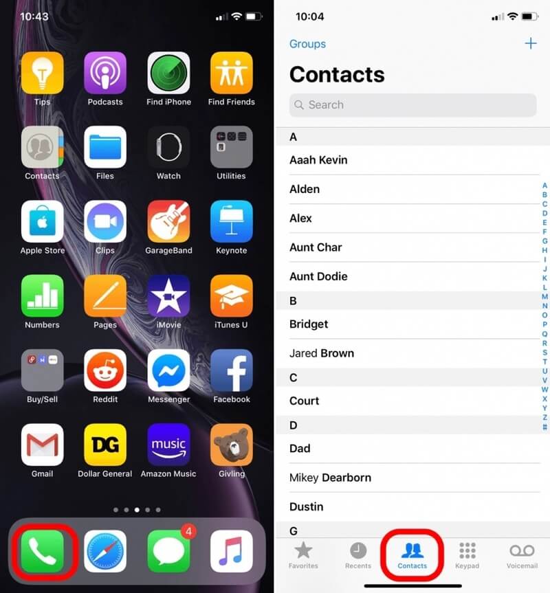 Xem số điện thoại ở mục Contacts tại Danh bạ
