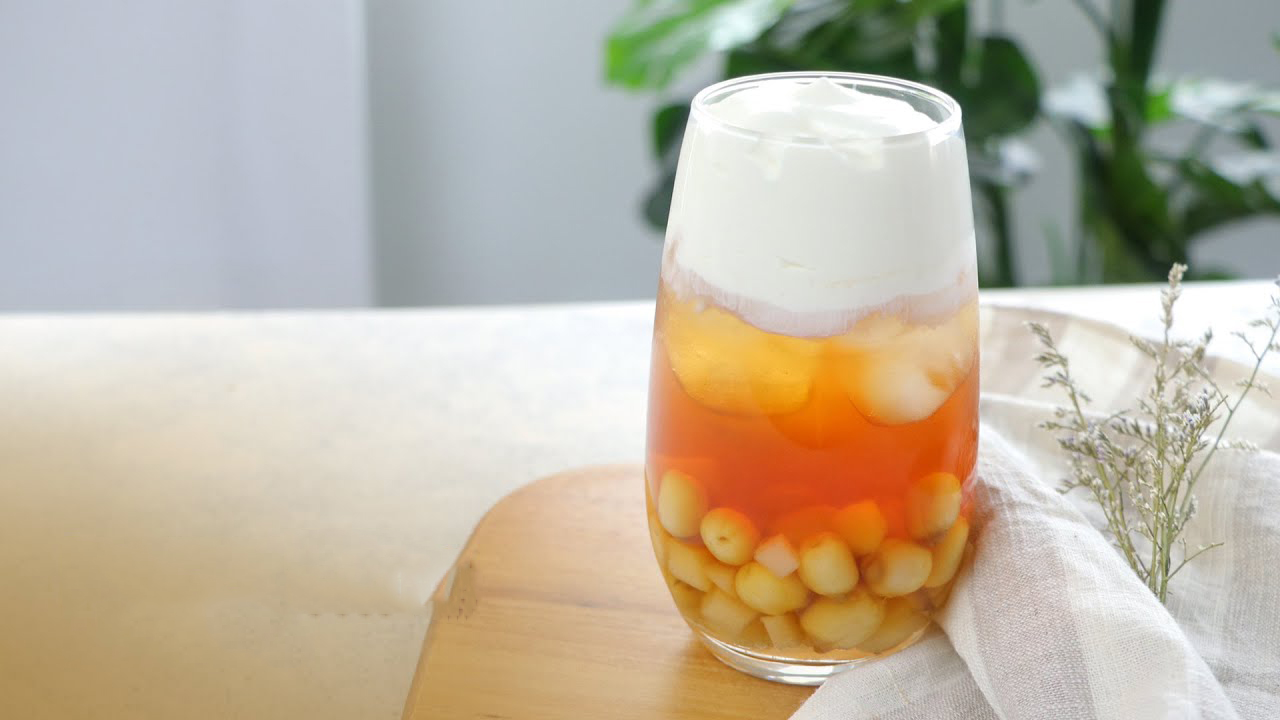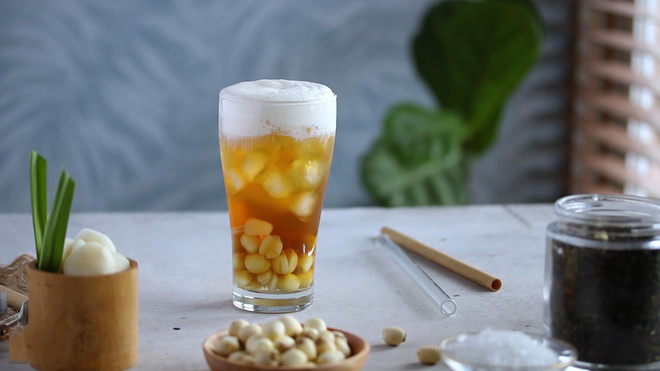 - Cho đá vào trà 1 lượng vừa đủ, quấy đảo đều. Bỏ hạt sen vào ly, cho tiếp trà vào cuối cùng thêm 1 lớp kem béo lên trên là bạn đã hoàn thành.