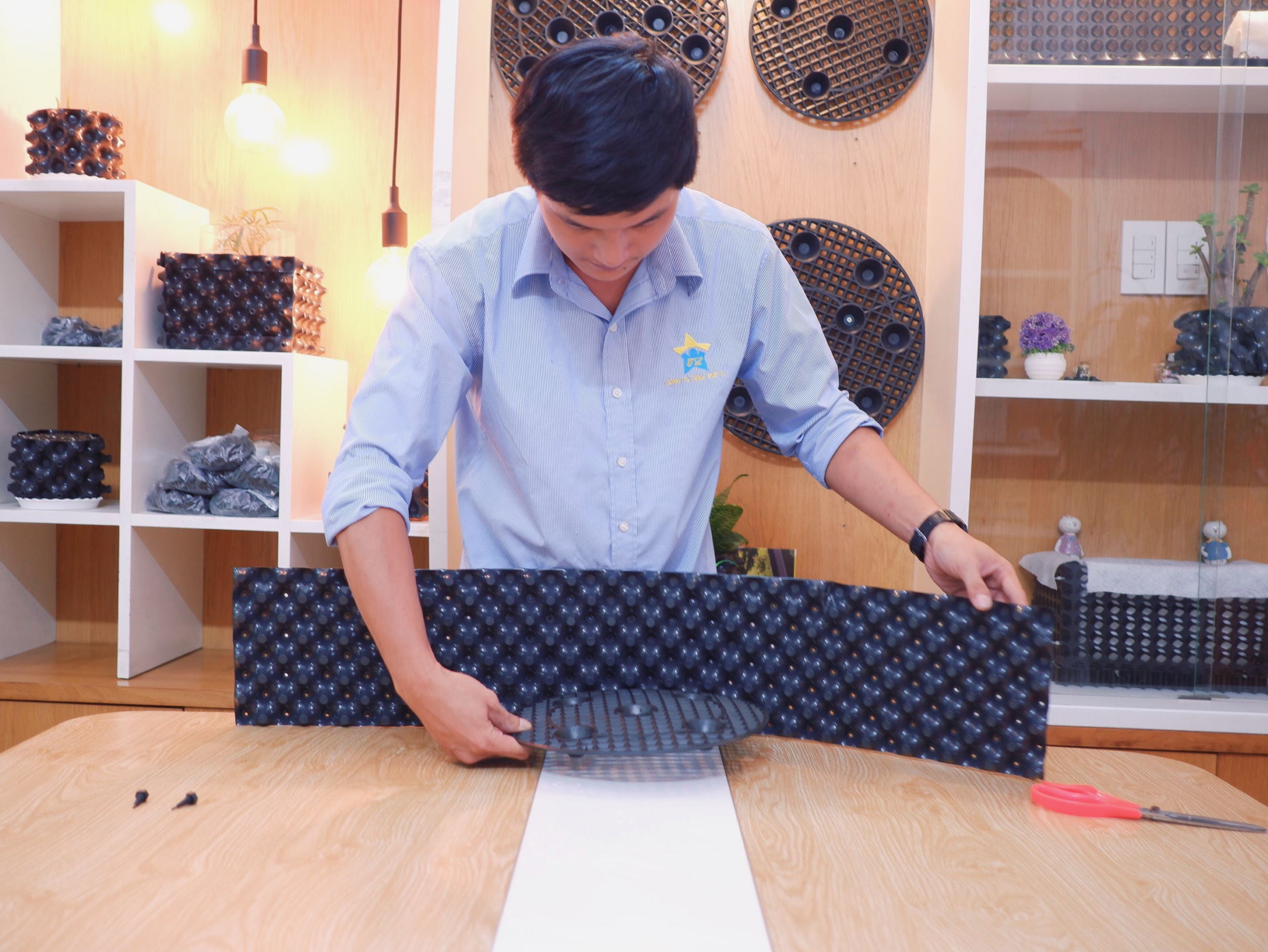 Đặt tấm đế nhựa lót vào tấm bầu ươm, sau đó cuộn tròn tấm bầu theo kích thước đế