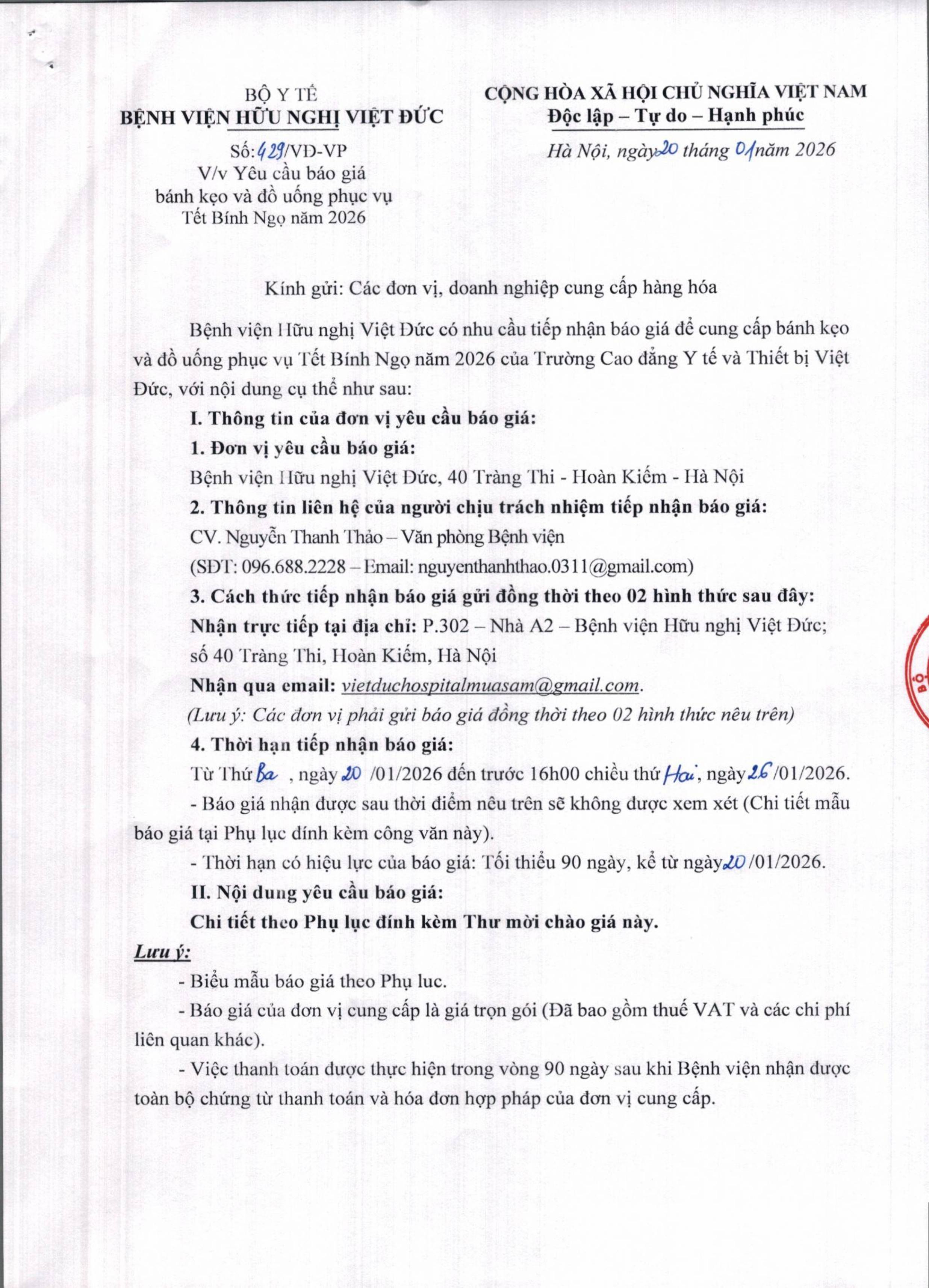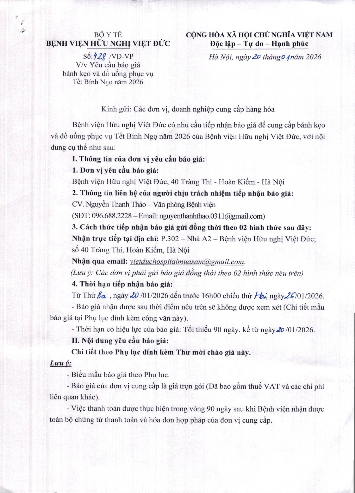 Bệnh viện Hữu nghị Việt Đức yêu cầu báo giá bánh kẹo và đồ uống phục vụ Tết Bính Ngọ năm 2026