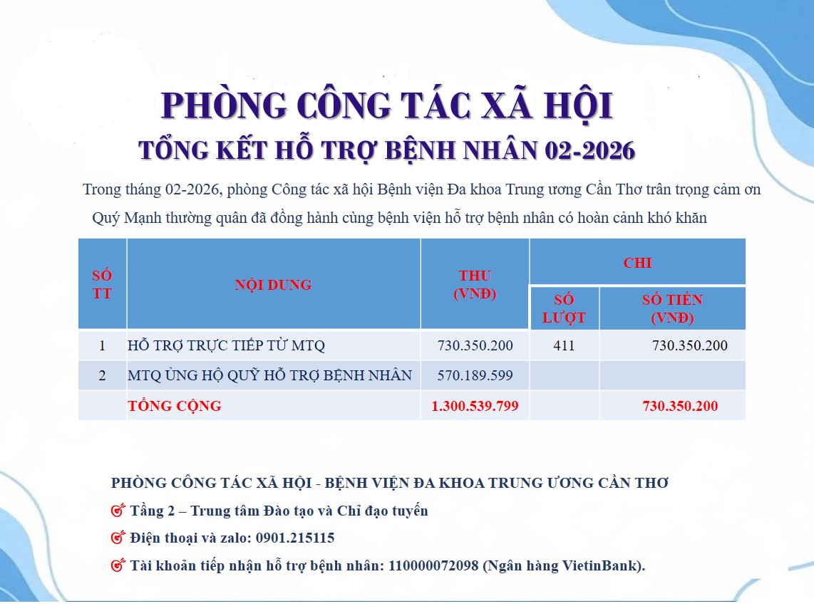 🌷Trong tháng 02-2026, phòng Công tác xã hội kết nối mạnh thường quân hỗ trợ bệnh nhân có hoàn cảnh khó khăn. Trong đó: 🌷Tổng thu: 1.300.539.799đ (bằng chữ: một tỷ ba trăm triệu năm trăm ba mươi chín nghìn bảy trăm chín mươi chín đồng) 🌷Tổng chi: Hỗ trợ...