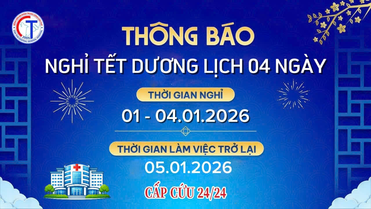 Bệnh viện Đa khoa Trung ương Cần Thơ thông báo lịch nghỉ Tết Dương lịch như sau: Khu Khám bệnh Thường và Bảo hiểm y tế: Ngày nghỉ: 04 ngày từ 01/01/2026 đến hết ngày 04/01/2026 (Thứ Năm đến Chủ nhật) Ngày làm việc trở lại: 05/01/2026 (Thứ Hai) Khu...