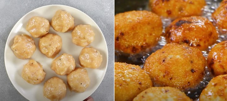 - Khi viên thịt gà, bạn thoa ít dầu ăn lên tay để không bị dính nhé. Khi vo viên bạn nên vo thành những viên nhỏ vừa ăn và đều nhau, và khi chiên sẽ chín đều đẹp và ngon hơn.