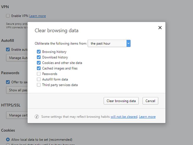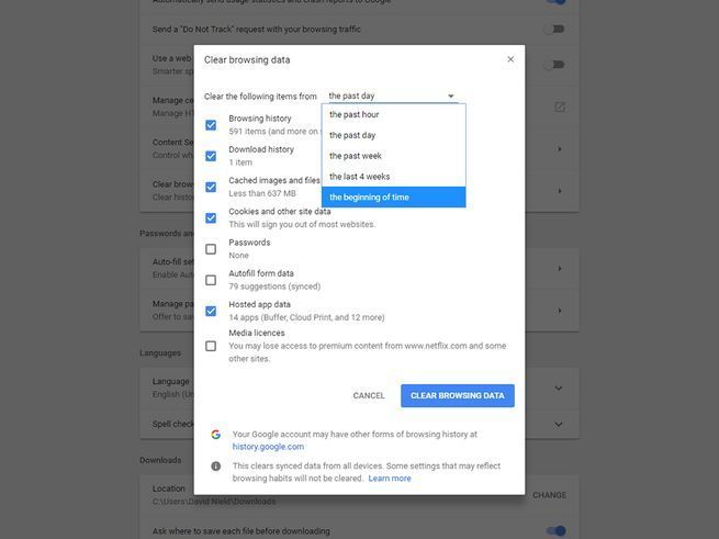 Ở Google Chrome, hãy ấn vào ba chấm ở bên phải thanh địa chỉ để mở, sau đó chọn đến Setttings (cài đặt). Kéo xuống và chọn Advanced (Cài đặt nâng cao), chọn Clear browsing data (Xoá dữ liệu duyệt web). Tại đây, bạn có thể tùy chọn từng khoảng thời gian mà bạn muốn xoá. Lưu ý: nếu bạn đồng bộ hóa trình duyệt với các máy tính khác nhau thông qua tài khoản Google, việc xóa lịch sử sẽ xóa luôn dữ liệu trên các thiết bị khác mà bạn đã đăng nhập vào Chrome.