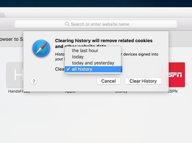 Nếu bạn đang sử dụng Apple Safari trên macOS, bạn có thể xóa lịch sử duyệt web bằng cách mở menu của Safari, sau đó nhấp vào xóa lịch sử. Lựa chọn khoảng thời gian mà bạn muốn xóa và xác nhận hoạt động.