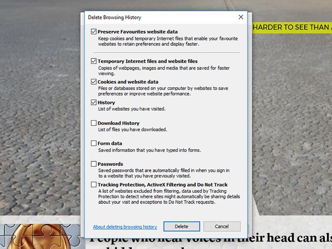 Trong trường hợp bạn vẫn dùng Internet Explorer, bạn có thể xóa lịch sử trình duyệt bằng cách nhấp vào biểu tượng răng cưa ở góc trên cùng bên phải, sau đó chọn Internet Options. Ở hộp thoại tiếp theo, mở tab General và nhấp vào Delete. Sau đó lựa chọn loại dữ liệu và nhấp Delete để hoàn tất thao tác.
