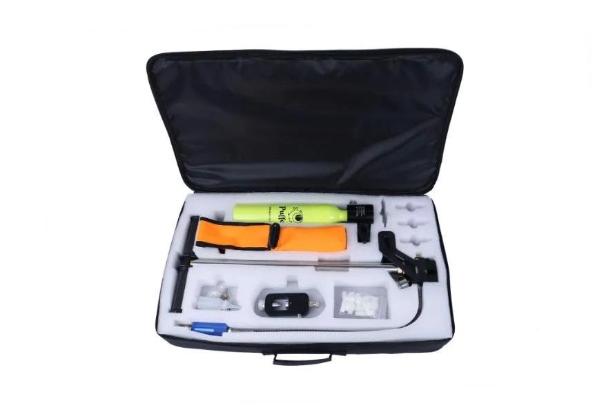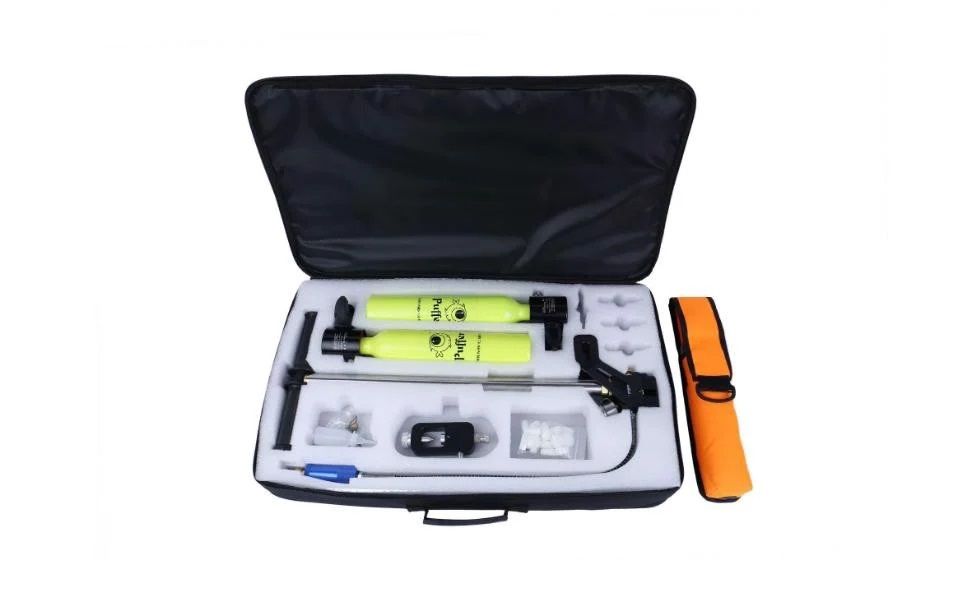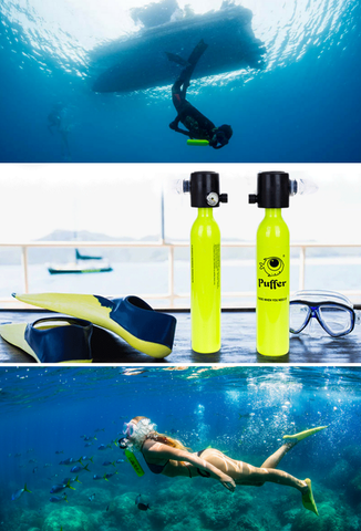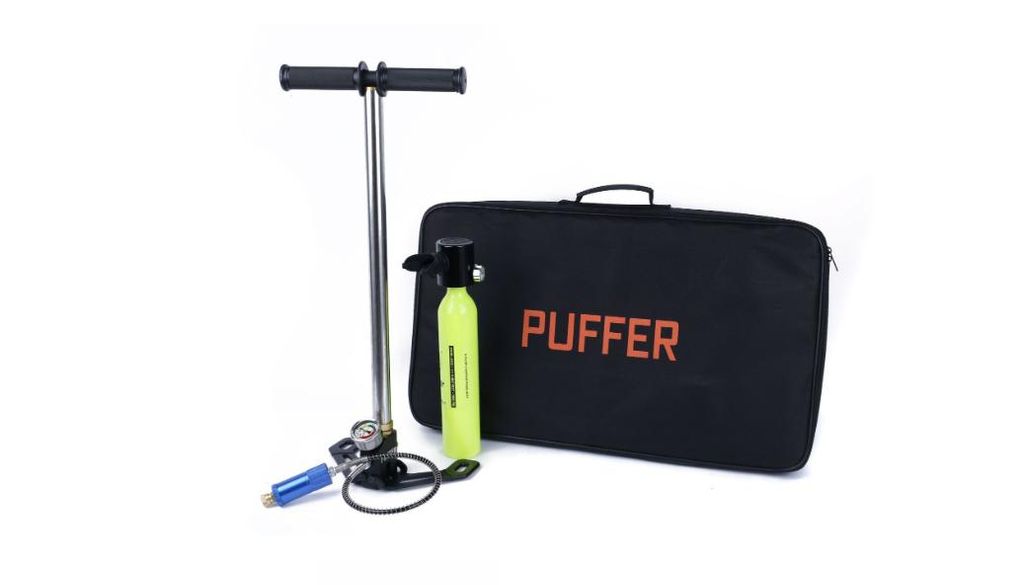 Bình lặn biển Puffer không phải là ống thở, cũng chẳng phải là bình Oxy chuyên nghiệp, mà nó chính là sự kết hợp độc đáo của 2 thiết bị trên. Bình dưỡng khí Puffer hoạt động như một chiếc bình nén không khí cực nhỏ gọn và có thể làm đầy lại không khí bằng bơm áp suất cao đi kèm.