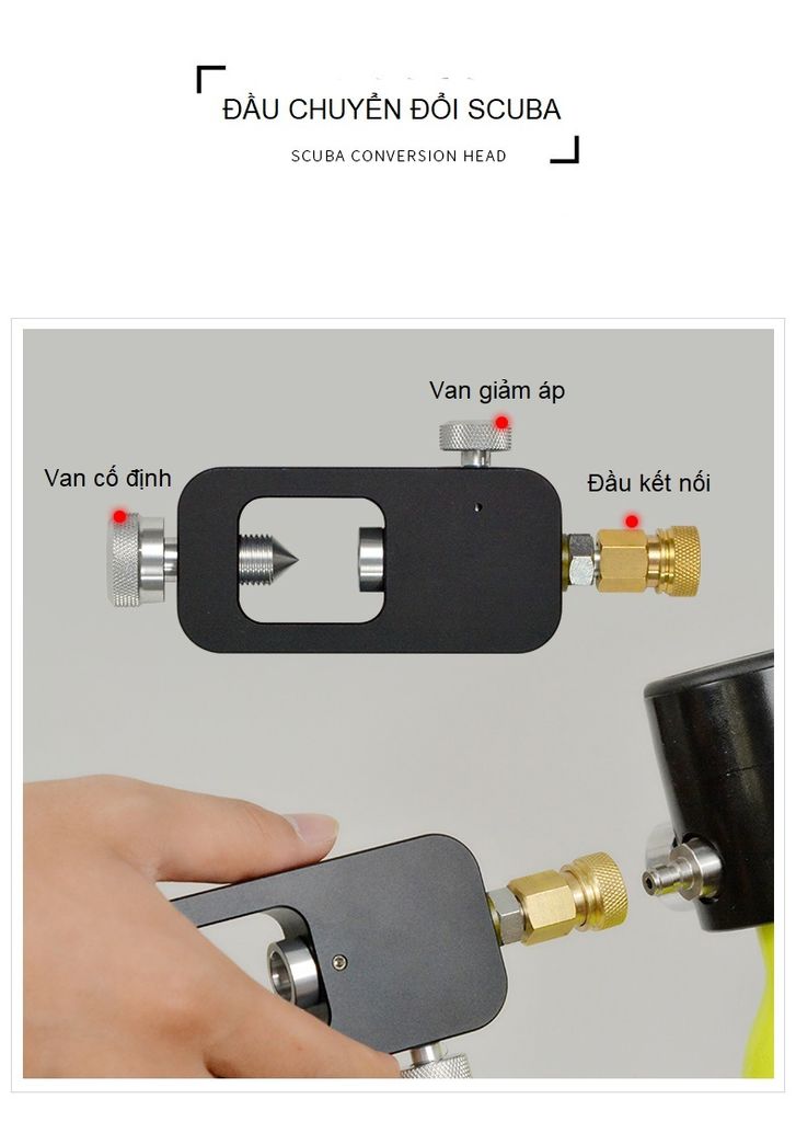 Đầu chuyển đổi là chi tiết quan trọng và chính nhất của sản phẩm này. Vì nó được tích hợp ống thở, van một chiều và đồng hồ đo áp suất. Với van một chiều bạn có thể hít thở dễ dàng dưới nước và bộ điều tiết khí bên trong giúp bạn điều tiết lượng khí phù hợp vào cơ thể