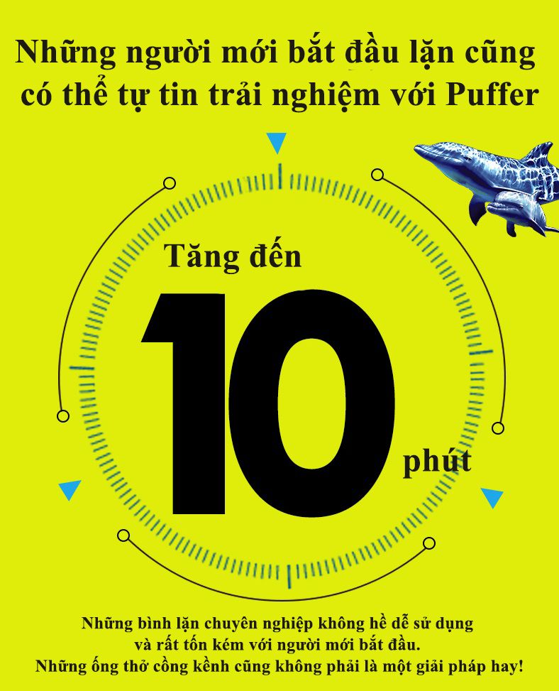 Bình lặn biển Puffer không phải là ống thở, cũng chẳng phải là bình Oxy chuyên nghiệp, mà nó chính là sự kết hợp độc đáo của 2 thiết bị trên.Bình dưỡng khí Puffer hoạt động như một chiếc bình nén không khí cực nhỏ gọn và có thể dễ dàng làm đầy lại không khí bằng bơm áp lực cao đi kèm.Chẳng cần bình Oxy cồng kềnh hay bất cứ thiết bị nào khác, giờ đây bạn sẽ có thể lặn thỏa thích lên đến 10 phút với chiếc bình dưỡng khí nhỏ gọn siêu tiện lợi Puffer - tự do bơi lội mà không lo ngại gì!!