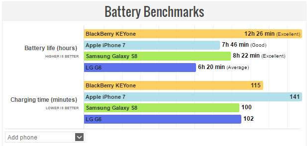 Qua trải nghiệm thực tế, BlackBerry KeyOne có thời gian sử dụng hỗn hợp lên tới 2 ngày giữa các lần sạc. Nếu bạn là một người có nhu cầu sử dụng máy nhiều thì chiếc máy dư sức hoạt động tới ngày thứ hai mới cần phải cắm sạc. Điểm Benchmarks pin của KeyOne cho thấy chiếc máy đã có thời gian sử dụng liên tục (on-screen time) cực kỳ ấn tượng khi lên tới 12 tiếng rưỡi, tức là hơn nửa ngày, vượt xa gần gấp đôi các mẫu Flagship hiện giờ như Apple iPhone 7 (7 tiếng 46 phút) và Samsung Galaxy S8 (8 tiếng 22 phút)