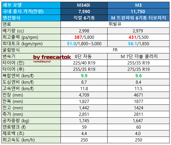 두 차량의 차이는 전설과 무서운 신입의 차이로 볼 수 있습니다. BMW에서도 고성능 버전을 상세로 나뉘는 분위기로 볼 수 있는데요. 벤츠 C43 그리고 C63 차이처럼 조금 다른 성능의 차이로도 해석할 수 있죠. 해외에서 두 차량의 비교는 M340i가 리틀 M3 또는 베이비 M3로 표현합니다. 성능 차이를 보인다는 내용인데요. 제원을 비교해 차이를 비교해보죠.