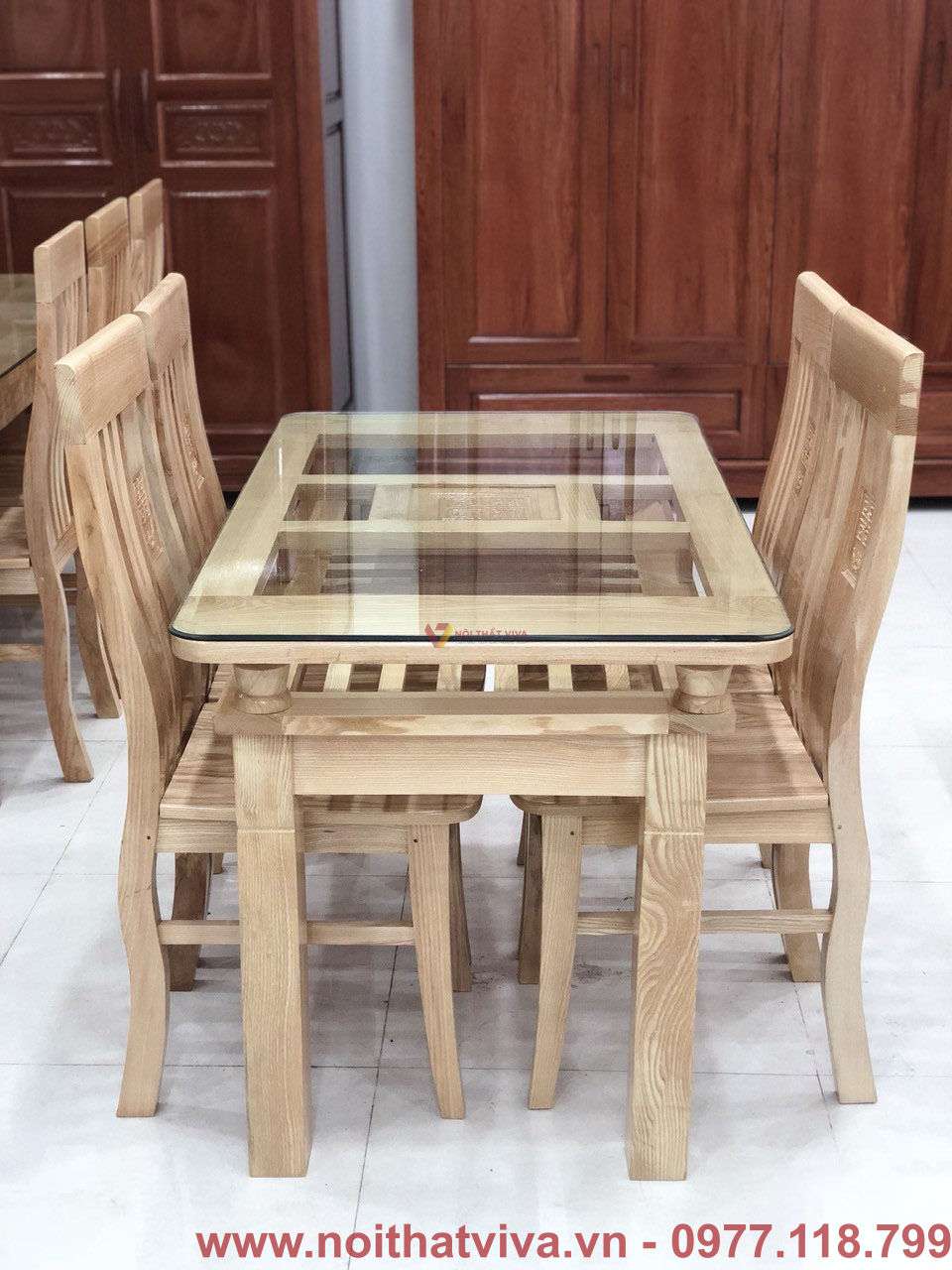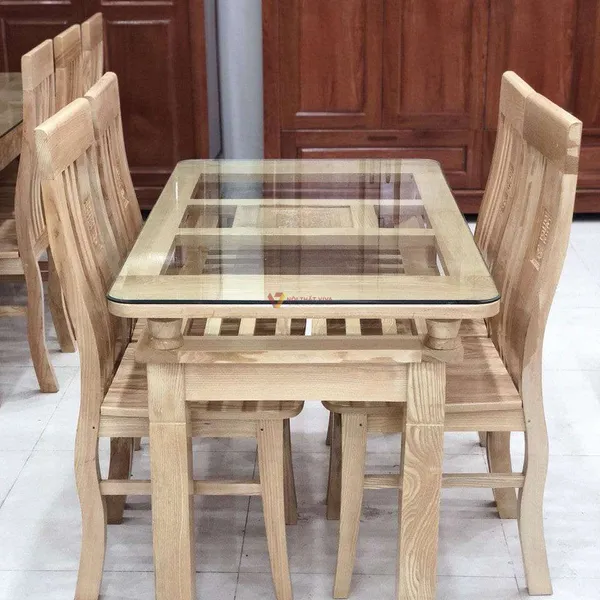 Mặt bàn gỗ được trang bị một lớp kính dày dặn tạo nên nét hiện đại và thanh lịch. Bên cạnh đó, kính chịu lực cũng giúp bạn dễ dàng hơn trong việc vệ sinh mặt bàn. Bốn chân trụ to thân vuông mang sự cứng cáp cho chiếc bàn, được phân chia đều ở 4 góc, có khả năng chịu lực cực tốt.