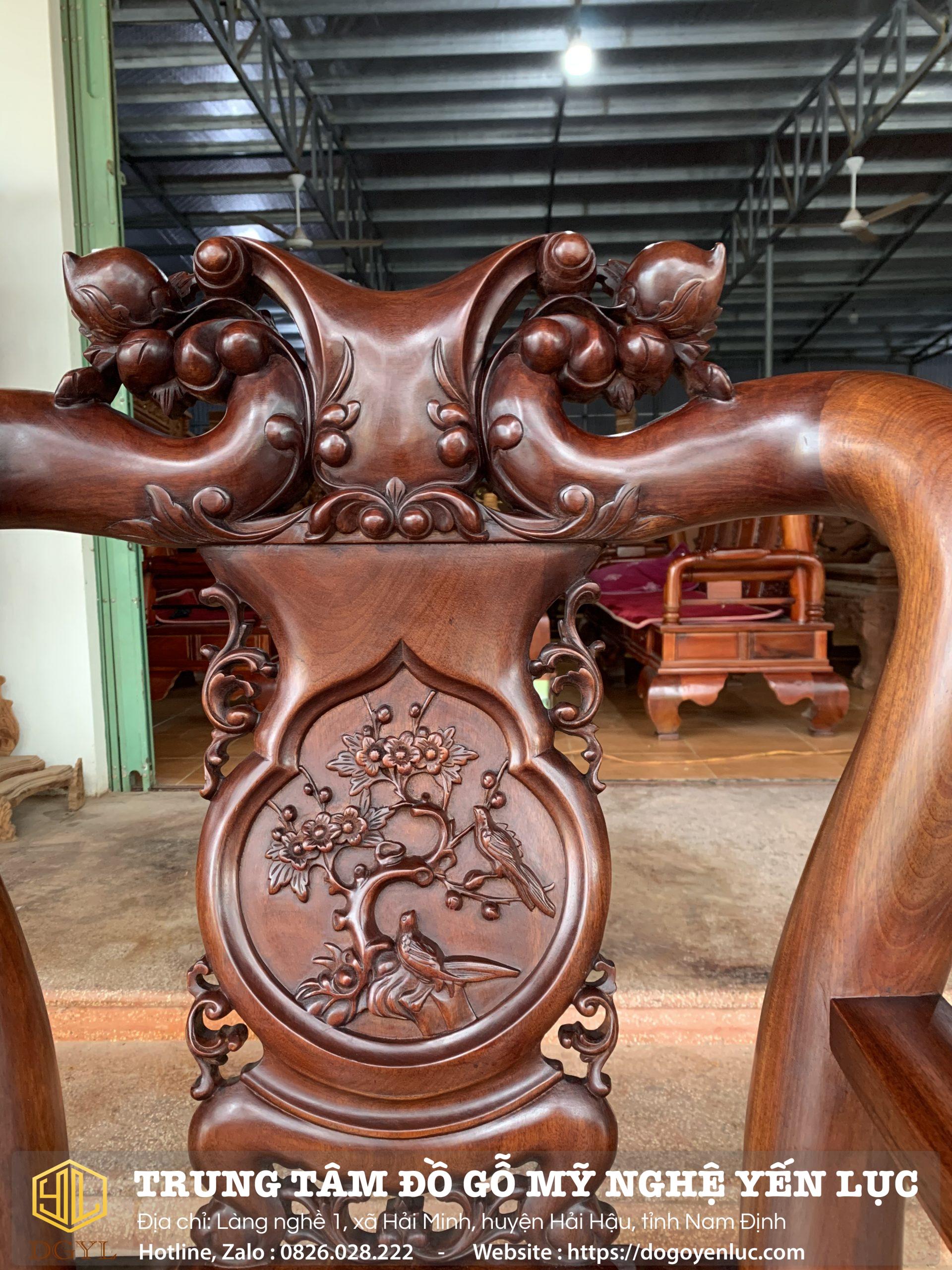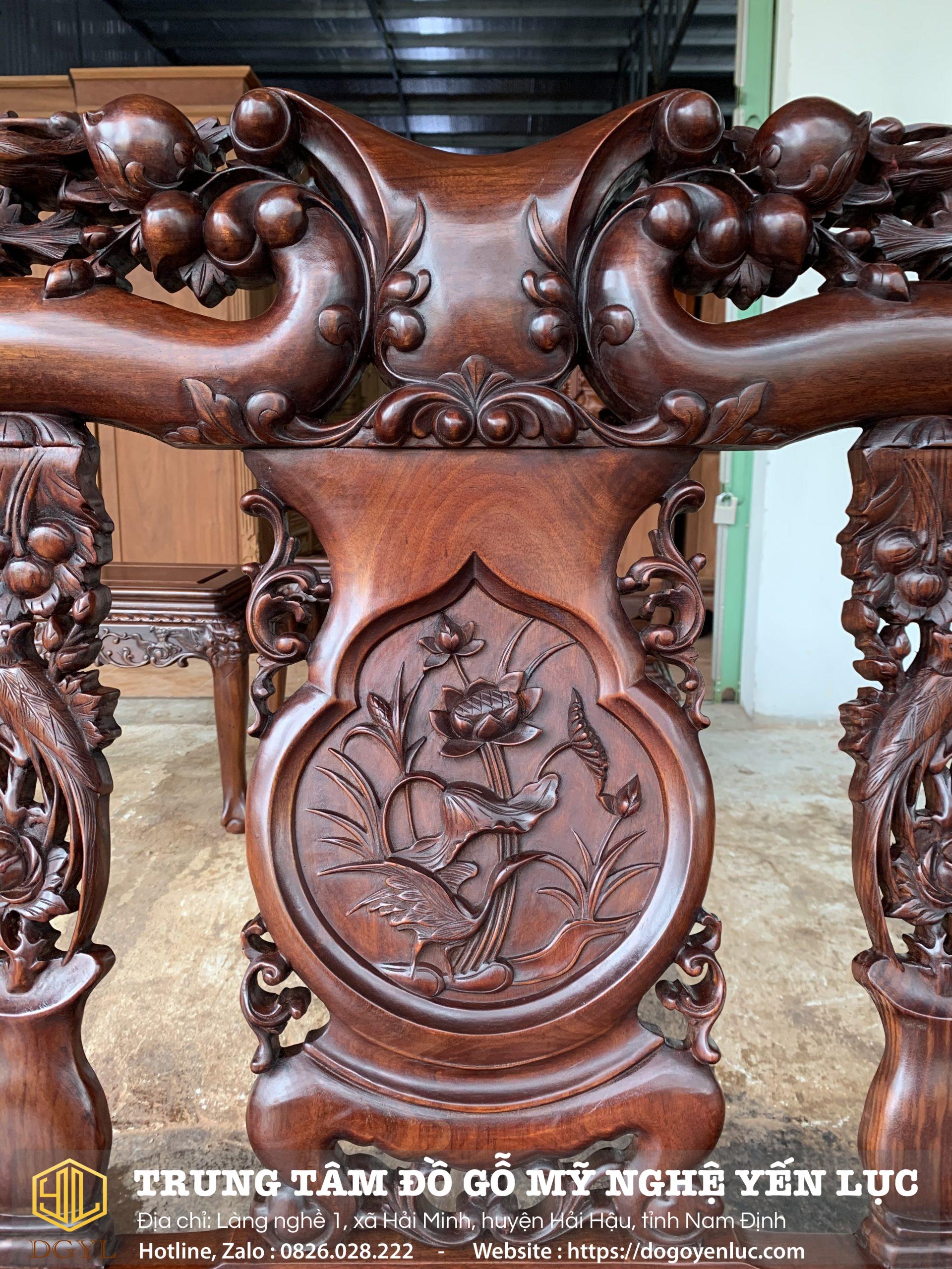 Bộ Bàn Ghế Minh Đào Tay 10 Gỗ Gụ Vách Lục Bình Đục Tay