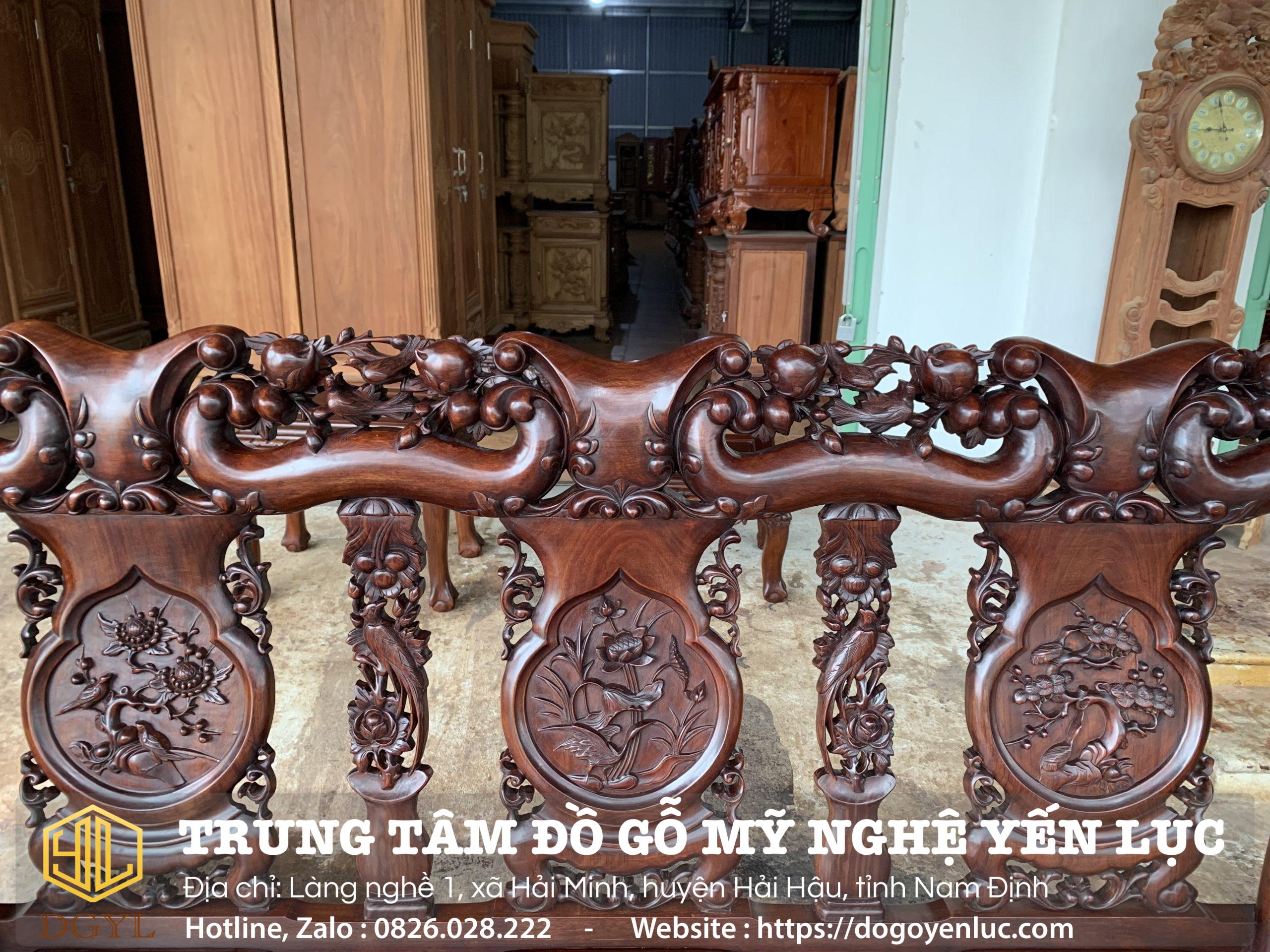 Vách ghế đoản đục theo cảnh ” trúc, sen, cúc, ” rất sắc nét và chi tiết