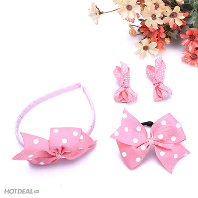- Gồm 1 băng đô + 1 cột tóc + 2 kẹp tóc được thắt nơ