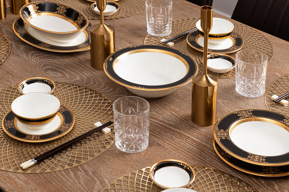 Trong số các bộ bát đĩa nổi bật, bộ bát đĩa Splendid Umber và Evening Majesty được nhiều người ưa chuộng nhờ vào chất liệu sứ dày dạn và an toàn cho sức khỏe. Không chỉ bền bỉ, món đồ này còn được trang trí với những họa tiết loang màu lục hay viền lam vàng, tạo nên vẻ đẹp thanh thoát mà vẫn sang trọng cho không gian ẩm thực.