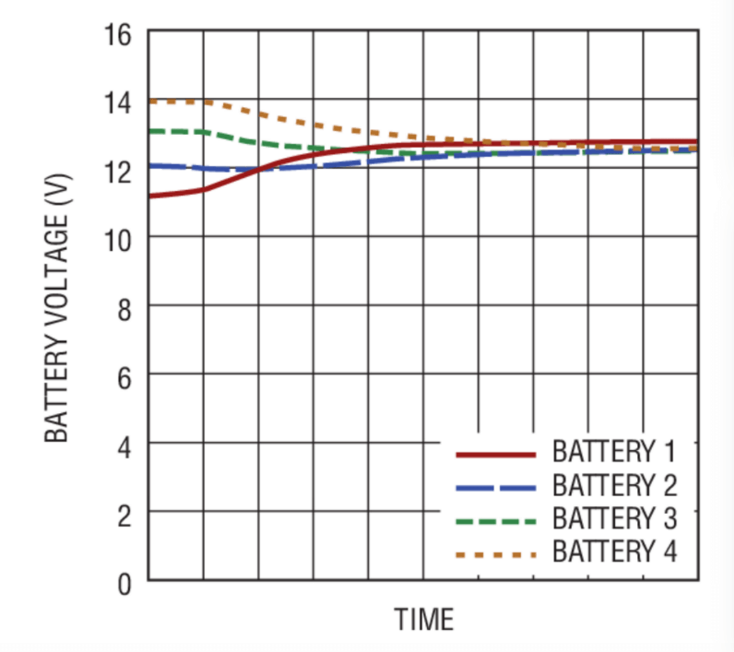 Như hình minh họa 01 dưới đây, ắc quy số 2 bị quá xả dưới mức an toàn và sẽ bị hỏng mau hơn các bình còn lại.
