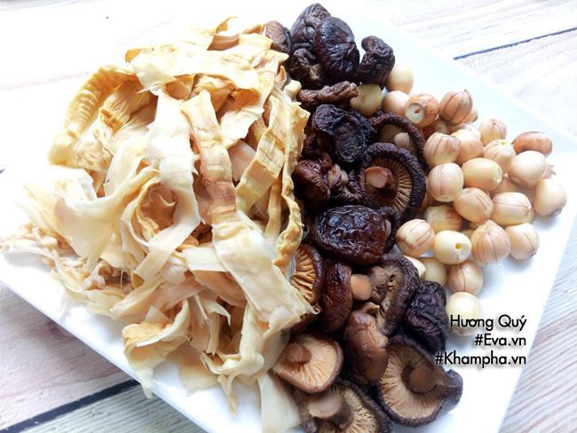 Bước 2: Nấm hương ngâm nước ấm, măng khô luộc xơ, xé nhỏ rửa lại cho sạch, hạt sen ngâm nước cho mềm.