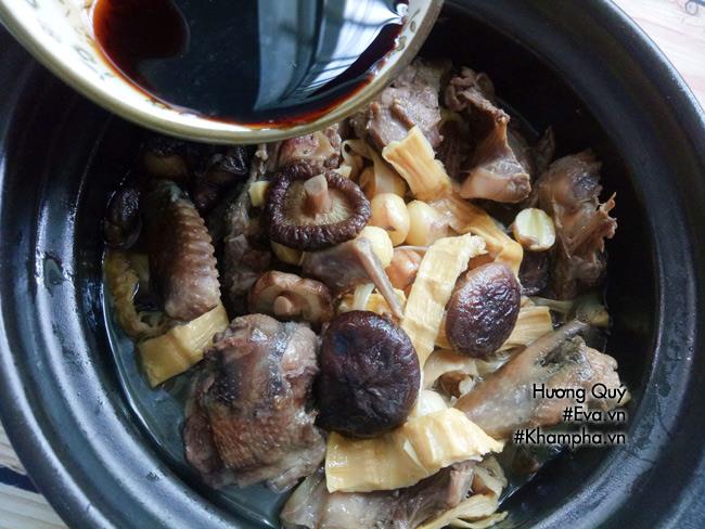 Bước 6: Cho bồ cầu, măng, nấm vào nồi thêm ít hạt sen cùng 3 thìa nước tương, ½ thìa bột nêm, ½ thìa bột canh, ½ bát con nước (gia vị cho sao cho vừa miệng nhé). Đậy vung đun nhỏ lửa để thịt chim bồ câu mềm là được.