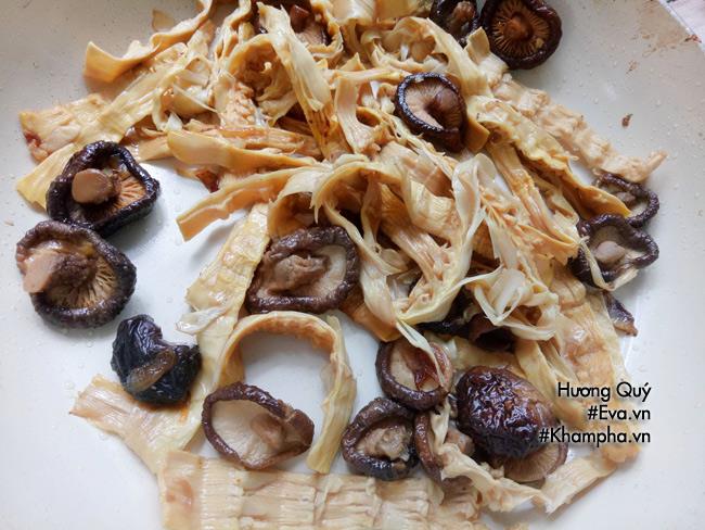 Bước 5: Ở một chảo khác phi thơm hành băm với chút dầu cho măng, nấm hương vào xào.