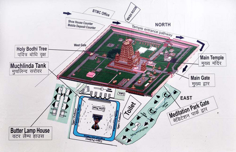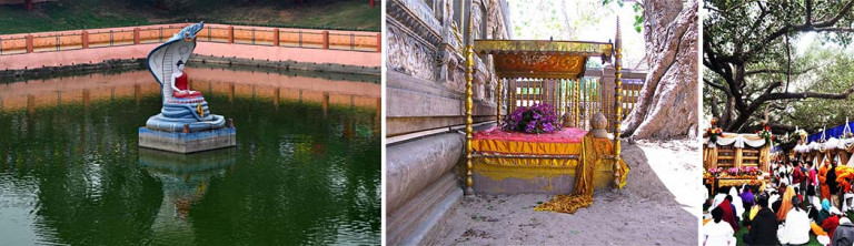 Tôi đi về phía Đông, trước mặt tháp Đại Giác có một tháp nhỏ, ghi dấu nơi đức Phật nói lời tạ ơn cây Bồ đề đã chở che trong những ngày thiền định (Hình 10). Phía Nam là một tháp nhỏ khác (Hình 11) kỷ niệm nơi đức Phật tu chứng được “tứ thiền” – nghĩa là bốn cấp độ nhập thiền (theo kinh Sa Môn Quả trong Trường Bộ Kinh); một trụ đá của vua Asoka (A Dục) được lắp dựng một phần thân trụ và có rào sắt bảo vệ bao quanh (Hình 12); cuối cùng là hồ Muchalinda, còn gọi là hồ sen, có một tượng Phật lộ thiên giữa hồ (nhưng không thấy sen trong hồ), với hình thần rắn khổng lồ dùng thân quấn quanh bệ ngồi và dùng đầu làm lộng che cho Ngài lúc tọa thiền (Hình 13).