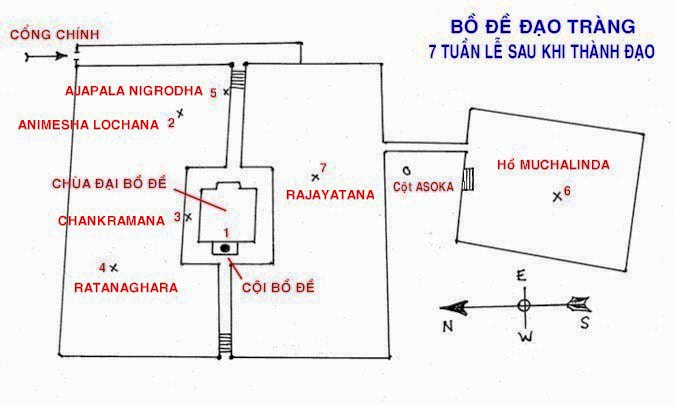 Sau khi đắc đạo, Ngài dành bảy tuần tiếp theo để tĩnh tâm suy nghĩ về sự giác ngộ. Ngoài cây Bồ đề, còn có sáu vị trí khác được cho là nơi đức Phật tọa thiền trong khu Bồ Đề Đạo Tràng – xem sơ đồ theo website phatgiao.org.vn, lập tháng 7/2013 (Hình 16). Tôi lưu ý ba trong số bảy vị trí, gồm: Vị trí số 5 (Ajapala Nigrodha), vào tuần thất thứ năm Ngài ngồi thiền dưới gốc cây Nigrodha – là loại cây đa đặc biệt của Ấn Độ mà những người chăn cừu (Ajapala) thường lui tới, có tên khoa học là Ficus Benghalensis (Hình 17). Vị trí số 6 (hồ Muchlinda, còn gọi là hồ sen), vào tuần thất thứ sáu Ngài ngồi thiền dưới gốc cây Mucalinda – là loại cây đước của vùng nước ngọt, có tên khoa học là Barringtonia Acutangula (Hình 18), Việt Nam còn gọi là “cây Lộc vừng”. (Tương truyền rằng: khi đức Phật ngồi thiền dưới cội cây này gặp một trận mưa bão trong nhiều ngày, rắn thần Naga bò đến uốn mình quấn quanh bệ ngồi thành bảy vòng và dùng đầu che cho Ngài khỏi bị ướt – từ đó, rắn thần có tên là Mucalinda). Vị trí số 7 (Rajayatana), vào tuần thất thứ bảy Ngài ngồi thiền dưới gốc cây Rajayatana – là loại cây bản địa thường dùng làm thuốc trong y học cổ truyền của người Ấn, có tên khoa học là Buchanania Cochinchinensis (Hình 19), thuộc họ “đào lộn hột” (Anacardiaceae).