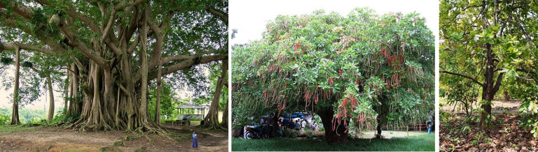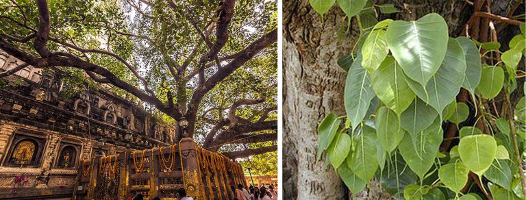 Đây là ba loại cây mà đức Phật ngồi thiền sau khi đắc đạo, để suy nghĩ về con đường “hoằng pháp” (đi giảng đạo) sắp đến, nhưng chỉ có cây Pipala tại vị trí số 1, nơi Ngài ngồi thiền đạt giác ngộ và thành Phật mới được gọi là cây “Bodhi” (âm tiếng Việt là “Bồ đề”) – vì nghĩa của nó là “tỉnh thức, giác ngộ”. Đây là loại cây thuộc dòng “cổ thụ” có rất nhiều tại Ấn Độ, Trung Quốc và Việt Nam, với quả nhỏ và lá hình trái tim (Hình 20), có tên khoa học là Ficus Religiosa. Hiện nay, cây Bồ đề được trồng tại nhiều nơi trên thế giới, nếu xác định có cội nguồn chiết xuất từ cây Bồ đề gốc tại Bồ Đề Đạo Tràng (Hình 21) mới được nhìn nhận là “hậu duệ” lưu truyền qua bao đời của “cội Bồ đề linh thiêng” (Holy Bodhi Tree), bởi sự tồn tại và phát triển của nó là cả một câu chuyện huyền thoại, gắn liền với lịch sử hình thành và phát triển khu Phật tích này…