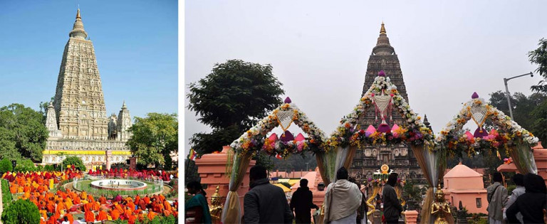Chúng tôi đến cổng chính phía Đông của khu Bồ Đề Đạo Tràng, mới biết trùng ngày “Khai hội tụng niệm quốc tế Tipikata” (The International Tipikata Chanting Council) vào ngày 02 tháng 12 hàng năm – theo đề xuất của tổ chức Hòa bình Thế giới (World Peace). Tại đây lắp dựng các cổng chào, treo màn, kết hoa và giăng cờ Phật giáo nhiều màu sắc, thật lộng lẫy. Nhìn tổng thể, các tòa tháp chính xây bằng đá, riêng những hạng mục phụ trợ chủ yếu xây bằng gạch, sơn một màu hồng như muốn tạo sự nổi bật so với các công trình cổ xưa trong khu di tích. Bên trong sân rất đông tăng ni, Phật tử từ các nước tụ về, tạo bầu không khí sinh động của ngày lễ hội tôn giáo hơn là cảnh tĩnh lặng thường thấy của một khu di tích có từ muôn thế kỷ (Hình 3&4).