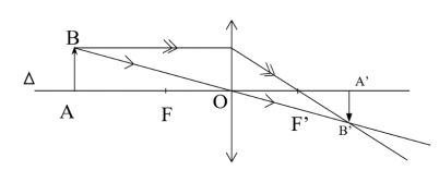 Đặt một vật sáng AB có chiều cao 2cm có dạng đoạn thẳng nhỏ vuông góc với trục chính của thấu kính hội tụ (điểm A nằm trên trục chính) và cách thấu kính một khoảng 12cm, thấu kính có tiêu cự f = 8cm.