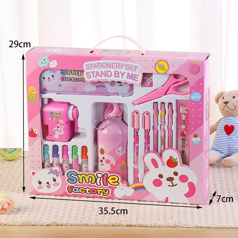 - Gồm 1 bộ đồ dùng học tập và 1 bình đựng nước