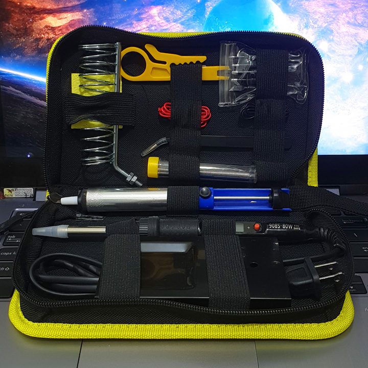 Đầy đủ phụ kiện đi kèm: 1 bộ gác mỏ hàn dạng lò xo, 1 bọt biển vệ sinh đầu hàn, 4 đầu mỏ hàn các loại (cùng với đầu có sẵn là 5), 1 dụng cụ tuốt đầu dây, 1 ống đựng thiếc có lỗ luồn ra ngoài (có luôn thiếc bên trong), 1 hút thiếc lực hút mạnh, 1 nhíp cong, 60cm dây điện đỏ + 60cm dây điện đen, 1 túi đựng có quai xách
