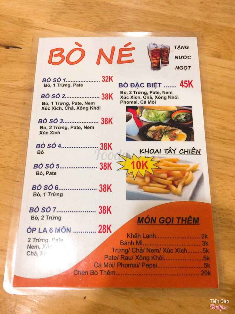 - Trung bình Viết bình luận Thông tin & Bản đồ Báo lỗi vị trí Thời gian hoạt động Chưa mở cửa 07:00 - 14:00 | 15:30 - 23:00 Thích hợp Buổi sáng , Buổi trưa , Buổi xế , Buổi tối Thời gian chuẩn bị Khoảng 10 - 15 phút Nghỉ lễ Các ngày lễ trong năm Thể loại Quán ăn Sức chứa 25 người lớn Phong cách ẩm thực Món Việt Phù hợp với Ăn gia đình , Họp nhóm , Tiệc ngoài trời Phục vụ các món Bánh mì , Thịt Bò , Bánh - Kẹo Giấy phép/chứng nhận Xem