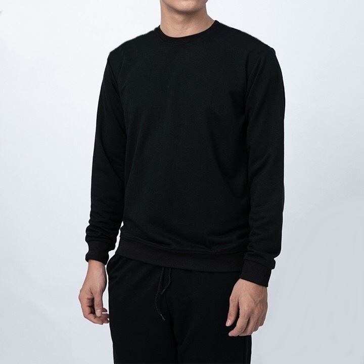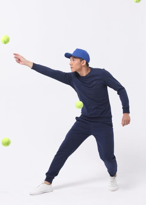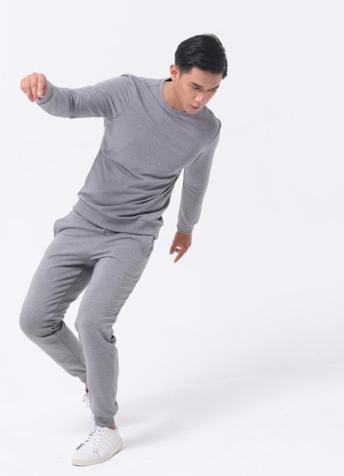 Áo cổ tròn, quần bo gấu. Bộ nỉ nam Kojiba có thiết kế basic, thêu họa tiết hoặc in chữ cách điệu