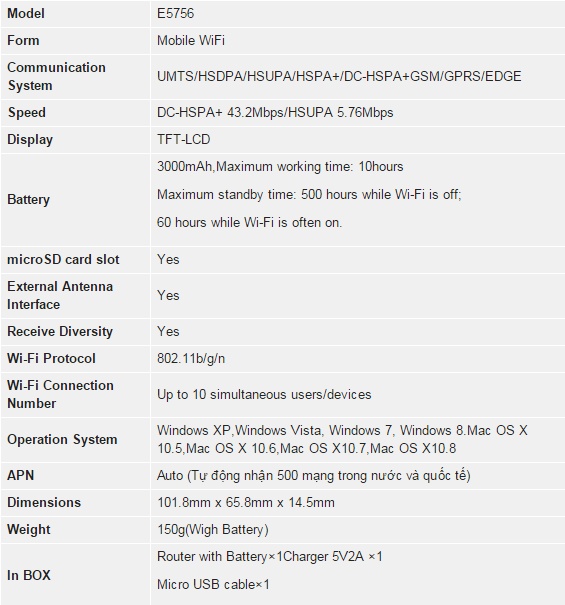 Nói về cấu hình Huawei E5756 thì ngoài thiết kế phong cách sang trọng với màn hình đèn LED hiển thị thông báo thì nó còn được trang bị chip tốc độ cao lên đến 43.2Mbps , cấu hình tự động nhận APN của hơn 500 mạng trên thế giới. Chỉ việc cắmsim 3G vào và tận hưởng truy cập internet tốc độ cao. Pin dung lượng lớn 3000 mAh, chạy liên tục tới 10h. Thiết bị Huawei E5756 này hỗ trợ truy cập cùng lúc tới 10 user, và khe cắm thẻ nhớ lên đến 32G.